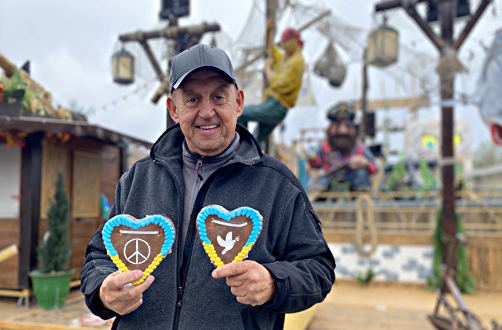 Bild: Richard Abendroth, Vorsitzender des Schaustellervereins mit den Ukraine-Herzchen.