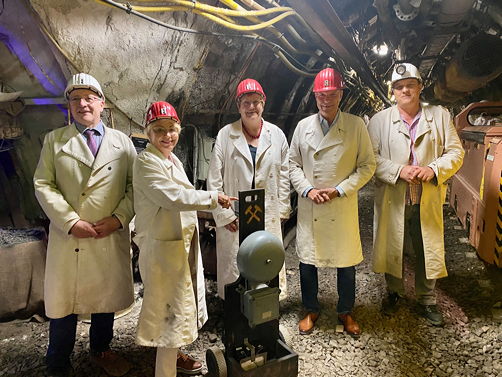 Bild: Mit Vertretern des Fördervereins starten Bürgermeister Christoph Tesche, Bärbel Bergerhoff-Wodopia und Karola Geiß-Netthöfel die erste offizielle Fahrt der neuen Grubenbahn im Trainingsbergwerk. Foto: Stadt RE