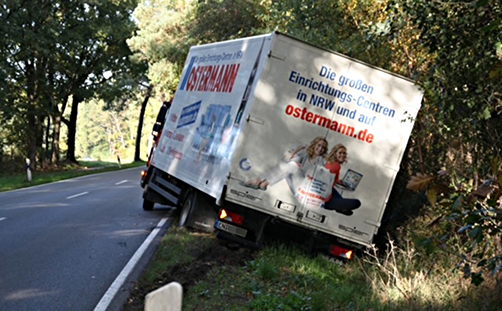 Der 7,5 Tonnen Möbeltransporter war auf der Straße zwischen Lembeck und Lippramsdorf unterwegs. Der Lkw-Fahrer, ein 34-jähriger Mann aus Witten, wollte einem Rettungswagen Platz machen, der sich auf einer Alarmfahrt befand. Bei diesem Ausweichmanöver kam der Lkw ein wenig zu weit auf den Grünstreifen und rutschte schließlich in den Graben.