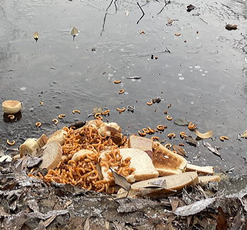 Jetzt machten Spaziergänger am Barkenberger See einen ähnlichen Fund. Unbekannte haben am Ufer des gefrorenen Gewässers größere Mengen an altem Brot, teilweise belegte Brötchen und auch Nudeln abgekippt. Auch wenn der See und somit auch das Essen nicht gefrorenen wäre, hilft es den Tieren nichts. Es ist ein Irrglaube, ihnen damit etwas Gutes zu tun. Das Gegenteil ist der Fall, denn wie gefährlich das Füttern der Wasservögel für die Tiere und das Gewässer sein kann, ist den „Spendern“ wahrscheinlich gar nicht bewusst.