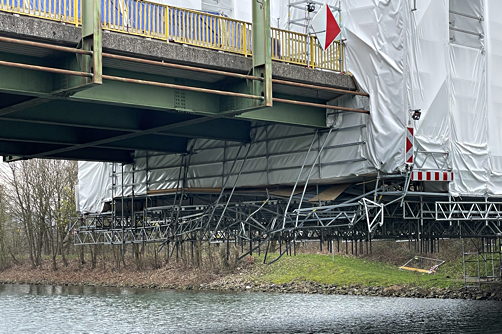 Der Kreis Recklinghausen lässt an der Drewer Brücke (Wulfener Straße, K 06) über den Wesel-Datteln-Kanal, westlich des Chemiepark Marl, Instandsetzungsarbeiten durchführen. 50 Jahre nach der Freigabe des Bauwerks für den Verkehr stehen umfangreiche Sanierungs- und Instandhaltungsarbeiten an. Für diese Arbeiten wurde das Baugerüst installiert.