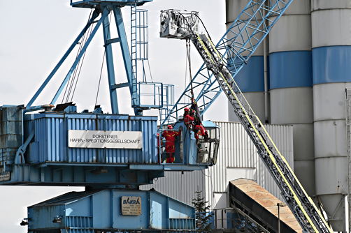 Dorsten. Im Industriegebiet Dorsten-Ost, genauer im Industriehafen des Wesel-Datteln-Kanals, musste ein Kranführer unter großem Aufwand mit Hilfe von Höhenrettern des Kreises Recklinghausen aus der Arbeitskanzel geborgen werden.