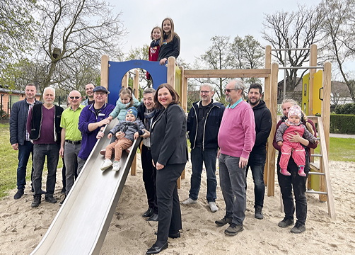 Bild: Wieder ein Ort zum Spielen: Vertreter des Kleingartenvereins, von Evonik, Bürgermeister Werner Arndt und einige Familien vor dem Kletterturm.
