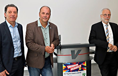 Bild: (v.l.n.r.) Holger Becker (stellv. Geschäftsführer der Vestischen Straßenbahnen GmbH), Thomas Prinz (DGB-Ortsverbandsvorsitzender) und Bürgermeister Matthias Müller sprachen beim Arbeitnehmerempfang 2023.