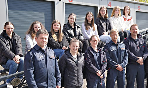 Bild: Zum Abschluss des Tages posierten die neugierigen Girls‘-Day-Teilnehmerinnen für ein Foto auf der Feuerwehrleiter.