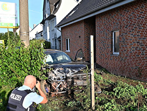 Gegen 6.50 Uhr befuhr der Unfallverursacher die Pliesterbecker Straße von der B 224 kommende in Richtung A 31. Augenscheinlich wollte der Fahrer wohl in die Breslauer Straße abbiegen und verlor dabei die Kontrolle über seinen VW. Das Auto kam von der Fahrbahn ab und krachte in die Hauswand. Zeugen berichteten, der Fahrer sei umgehend ausgestiegen und von der Unfallstelle weggerannt. Zeugen konnten den Fahrer aber beschreiben.