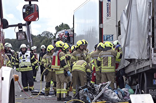 Der 69-jährige Mann aus Dorsten war nach Angaben der Polizei aus noch ungeklärter Ursache zwischen dem Rastplatz Elsholt und der Anschlussstelle Hamminkeln in Fahrtrichtung Oberhausen auf ein Stauende gerast. Die Autobahnpolizei Düsseldorf bestätigte auf Anfrage, dass es sich bei dem Transporter um das Fahrzeug einer Altkleidersammlung handelt. Nach der schweren Kollision mit einem stehenden Lkw lagen mehrere Kleidersäcke auf der Fahrbahn, das Führerhaus des 7,5t Kleinlaster ist komplett eingedrückt.