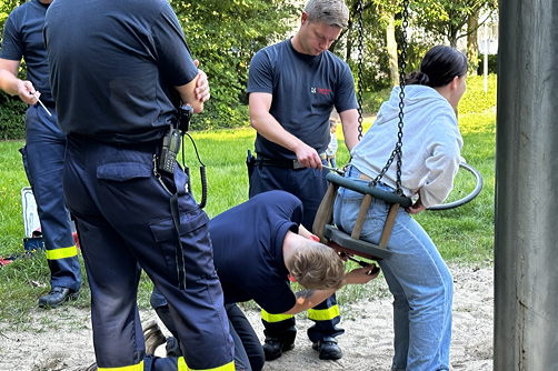 Die herbeigerufenen Einsatzkräfte mussten den Schaukelsitz mit verschiedenen Werkzeugen aufwendig auseinander schrauben, um das Mädchen frei zu bekommen. „Es kam mir schon recht lange vor, aber ich bin der Feuerwehr echt dankbar, dass sie mich befreit haben. Jetzt tun mir zwar meine Oberschenkel weh, aber es geht schon wieder“, berichtete die 14-jährige Aline nach ihrer geglückten Rettung. Im Anschluss wurde die Schaukel von den Feuerwehrmännern wieder zusammengebaut. Danach konnte diese auch wieder problemlos genutzt werden, dieses Mal aber von deutlich jüngeren Kindern. Ein Happy End für alle Beteiligten.