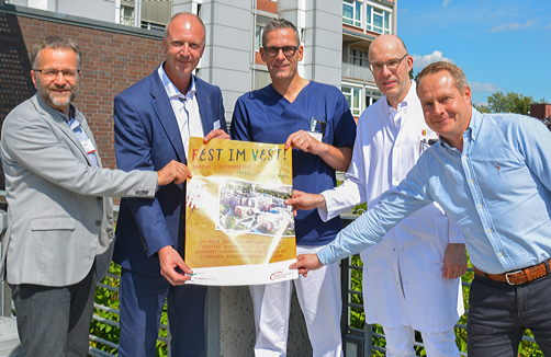 Bild: Das Klinikum Vest freut sich auf viele Besucherinnen und Besucher beim „Fest im Vest“ an der Paracelsus-Klinik Marl: (v.l.) Thomas Wallrad, Projektmanager, Norbert Vongehr, Geschäftsführer des Klinikums Vest, Dr. Lars-Christoph Linke, Chefarzt der Klinik für Orthopädie, PD Dr. Markus Reiser, Chefarzt für Innere Medizin und Mario Löblein, Pflegedirektor.