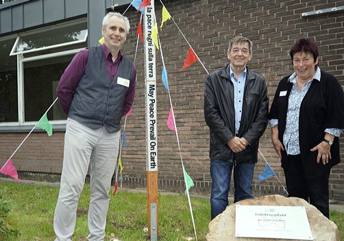 Marianne Pelz, Sprecherin der VHS-Kursleitenden: „Dieser Friedenspfahl ist ein Leuchtturm der Hoffnung auf weltweiten Frieden.“ Die beiden Marler Friedenspfähle gehen auf die Initiative der internationalen Organisation „Mayors for Peace“ zurück. Die Stadt Marl ist seit 1986 Mitglied. Mit Aktionen und Kampagnen engagieren sich die Mitgliedsstädte für eine friedliche Welt ohne Atomwaffen und den Frieden der Nationen.