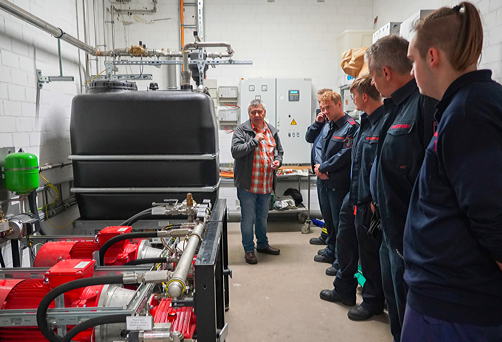 Peter Blomtrath, Brandschutzbeauftragter des Klinikums Vest, lieferte an diesem Morgen einen Überblick über das Klinikgebäude, inklusive Rettungswege und Feuerwehraufzug. Im Falle eines Brandes oder einer Verrauchung helfen sogenannte Parallelanzeigen, die auf den Stationen installiert sind, den Mitarbeitern, das Ereignis in der Klinik schnell zu lokalisieren, so Blomtrath. Teil der Ortsbegehung war auch die Begutachtung der Hochdruckwassernebellöschanlage samt Wassertank. Die Anlage löst im Falle eines Brandes einen Sprühnebel auf den betroffenen Stationen aus.