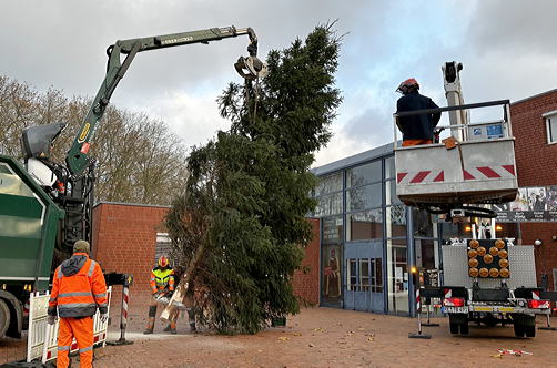 Unser Foto entstand in Dorsten-Wulfen, wo städtische Mitarbeiter diese schön gewachsene Fichte direkt vor dem Gemeinschaftshaus installiert haben. Dafür wurde extra in diesem Herbst eine neue Bodenhülse angefertigt, die den Baum aufnehmen kann.