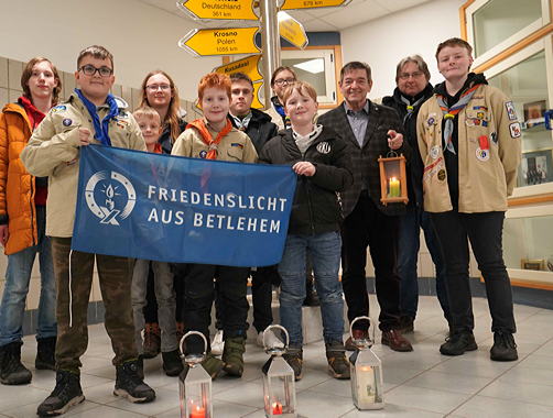 „Das Friedenslicht ist gerade in diesen schwierigen Zeiten mit all den Nöten der Menschen und den Kriegen auf der Welt ein Zeichen der Hoffnung“, sagte der Bürgermeister und versprach, das Licht an einem Ehrenplatz im Stadthaus zu stellen.