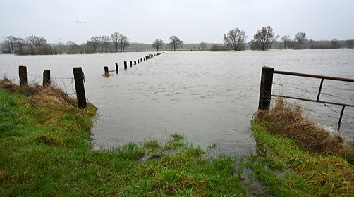 Die Wiesenflächen, als auch Bäume und Sträucher, standen im Bereich der Borkener Straße gut sichtbar unter Wasser. Von einem Hochwasser spricht der Lippeverband in Dorsten ab 7,66 Metern.