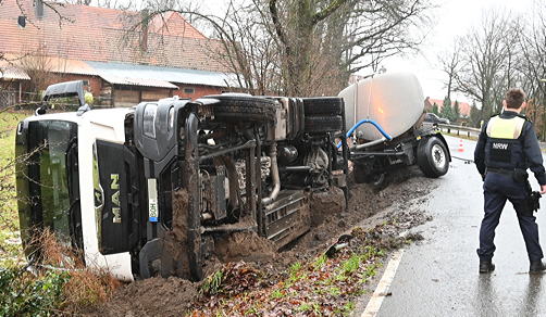 Haltern. An Heiligabend ereignete sich in Haltern-Holtwick ein Lkw Unfall. Der Lastwagen hatte bei den Landwirten in der Ortschaft frische Milch abgeholt und war auf der Holtwicker Straße unterwegs, als der 58-jährige Fahrer aus Essen bei enger Fahrbahn mit den Reifen der Zugmaschine in den aufgeweichten Grünstreifen geriet und in den Graben rutschte.