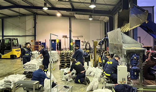 Das Technische Hilfswerk (THW) füllt seit dem gestrigen Nachmittag unter Hochdruck Sandsäcke an einer zentralen Stelle. Von dort werden sie bei Bedarf direkt an die Einsatzorte gebracht.