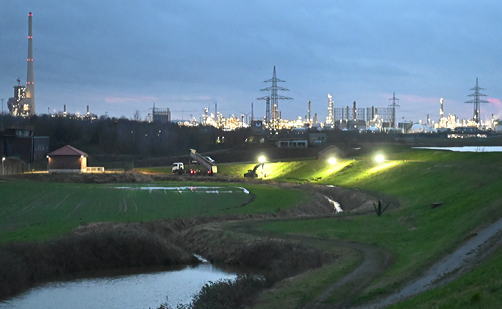 Mit mehreren Lkws lässt der Lippeverband seit dem frühen Donnerstagabend tonnenweise Kalkstein zum Lippedeich zwischen Haltern-Lippramsdorf und Marl anliefern. Auf rund 100 Metern entlang des Deichfußes werden insgesamt 2.500 Tonnen des Materials aufgeschüttet, um den Deich zu stärken. „Es handelt sich um eine reine Präventivmaßnahme“, sagt Lippeverband-Sprecher Ilias Abawi, der ebenfalls gebetsmühlenartig wiederholt, dass eine akute Gefahr nicht bestehe.
