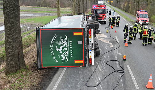 Schermbeck. In Höhe Loosenberge kam ein Lkw von der Straße ab, geriet ins Schleudern und kippte auf die Seite. Der 49-jährige Fahrer erlitt leichte Verletzungen, seine Ladung – leere Bierkisten – verteilten sich teilweise im Umfeld.