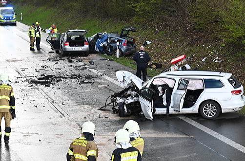 Die Insassen der anderen beiden Fahrzeuge – darunter auch drei Kinder – wurden schwer verletzt in Krankenhäuser gebracht.. Die Polizei sicherte an der Unfallstelle die Spuren und machte unter anderem auch Drohnenaufnahmen. Auch ein Rettungshubschrauber war vor Ort. Ein Spezial-Unfallteam der Polizei analysierte das Geschehen.