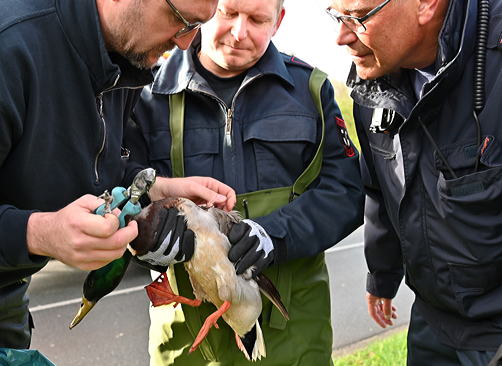 Dorsten. In Wathose und mit einer Zange bewaffnet, befreiten Feuerwehrmänner einen Erpel aus misslicher Lage. Das Tier hatte sich in einem Stacheldrahtzaun verfangen und konnte sich nicht aus eigener Kraft befreien.