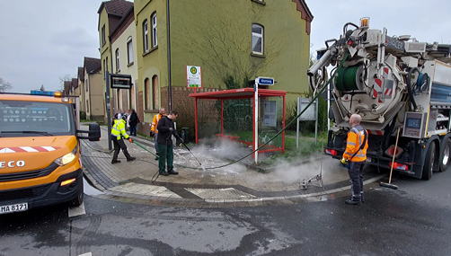 In Zusammenarbeit mit der Kanalreinigung, der Schreinerei und den Friedhöfen des ZBH reinigten die Mitarbeiterinnen und Mitarbeiter die Bushaltestelle. Zum Einsatz kamen ein Spülwagen mit Hochdruckreiniger und ein Fahrzeug mit einer Heißwassermaschine. „Dieser Einsatz hat wieder einmal sehr eindrucksvoll gezeigt, wie leistungsstark und flexibel unser Betriebshof ist“, freute sich ZBH-Chef Michael Lauche nach der Aktion.