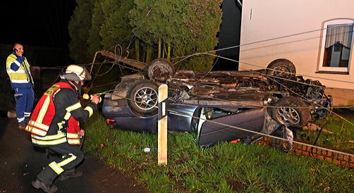 Den Einsatzkräften bot sich ein Bild der Verwüstung. Glücklicherweise bestätigte sich vor Ort dann nicht, dass es eingeklemmte Personen gibt. Vermutlich war der junge Fahrer wohl deutlich zu schnell auf der kleinen Straße unterwegs und hatte dann die Kontrolle über den Mercedes verloren. Das Auto rammte zunächst zwei Strommasten, die umkippten, und prallte dann gegen einen Zaun und eine Mauer, überschlug sich und landete schließlich auf dem Dach in einem Vorgarten.