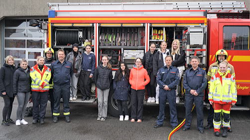 Bild: Rund um Feuerwehr-Chef Rainald Pöter (3.v.r.) gäbe es für die Mädchen am „Girls’Day“ einen Einblick in die Arbeit der Feuerwehr. Auch dabei: Organisatorinnen Kim-Karina Bönte, Gleichstellungsbeauftragte der Stadt Marl (links) und Jana Biebusch (Stadt Marl).