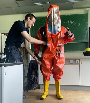Dabei bekamen die Schülerinnen und Schüler Einblick in das Einsatzgeschehen der Feuerwehr, konnten Fragen zur Thematik stellen und erfuhren Details zu den einzelnen Messmöglichkeiten sowie Messstrategien an ausgemusterten Messgeräten. Zum Schluss ließ es sich Physiklehrer Florian Rüther nicht nehmen, selbst in einen Chemikalienschutzanzug zu steigen, um sich ein eigenes Bild vom Tragen der Ausrüstung zu machen. Bei einer entsprechenden Einsatzlage kann so schon mal ein zusätzliches Gewicht von rund 50 Kilogramm zusammenkommen. Letztlich durfte auch eine kleine Fragerunde zum Thema Feuerwehr und Ausbildung nicht fehlen.