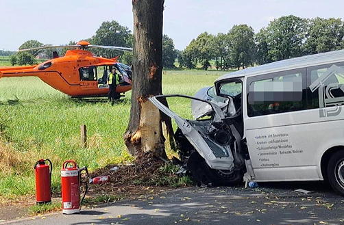 Gegen 14.00 Uhr wurden die Rettungskräfte von Polizei und Feuerwehr alarmiert. Aus bislang unbekannten Gründen war der Transporter gegen einen Straßenbaum geprallt. Neben dem Fahrer (57, aus Borken) befanden sich noch weitere sieben Insassen mit im Fahrzeug. Neben etlichen Rettungswagen und Notarzteinsatzfahrzeugen, wurde auch ein Rettungshubschrauber zur Einsatzstelle alarmiert.