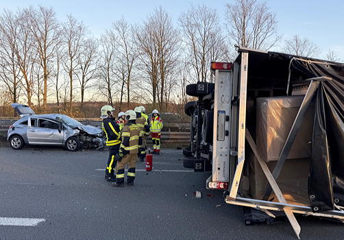 Haltern. Aus bislang unbekannten Gründen kam es am Samstagnachmittag auf der A43 in Höhe Haltern am See zur Kollision eines mit Möbel beladener Klein-Lkw und einem Pkw. Der Lkw kam dabei auf der Seite liegend zum Stillstand und blockierte beide Fahrspuren in Fahrtrichtung Recklinghausen.