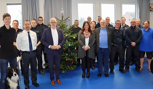 Bild: Große Runde am Weihnachtsbaum in der Feuerwache Herten: Am 24. Dezember empfingen die diensthabenden Feuerwehrleute Bürgermeister Matthias Müller, Jürgen Grunwald (stellvertretender Bürgermeister), Silvia Godde (stellvertretende Bürgermeisterin), Nicole Barciaga (stellvertretende Bürgermeisterin) sowie den stellvertretenden Personalratsvorsitzenden Eberhard Conrad und das Kreisbrandmeister-Team.