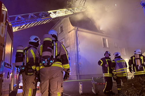 Vor Ort bestätigten sich dann die Befürchtungen: eine Wohnung im Dachbereich stand in Vollbrand, Flammen drangen bereits durch Fenster nach draußen. Die Einsatzkräfte rückten ins Dachgeschoss vor, bekämpften im so genannten Innenangriff die Flammen, während ihre Kameraden von draußen per Drehleiter das Feuer kontrollierten.
