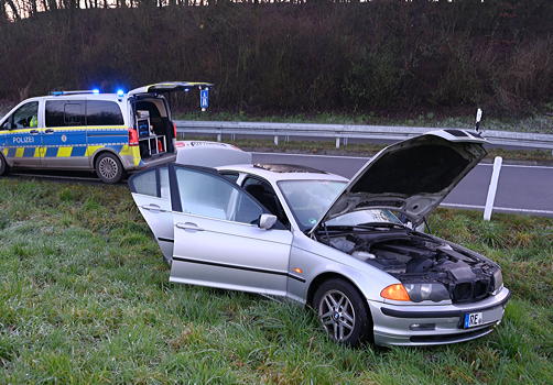 Ein bislang unbekannter Fahrer befuhr die Autobahn von Schermbeck in Richtung Dorsten. In der Anschlussstelle zur Königsberger Allee kam der Wagen aus bislang unbekannten Gründen von der Fahrbahn ab und landete im Grünstreifen. Hier verunfallte der Pkw so, dass die Airbags am Wagen auslösten. Der Fahrer konnte noch vor Eintreffen eines zufällig vorbeifahrenden Streifenwagens von der Unfallstelle flüchten. Er wurde nur von weitem gesichtet, wie er in Richtung Autobahn zurück rannte.