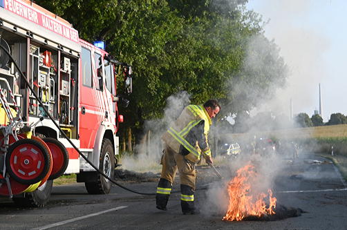 Der Mann entschied sich, seine Fahrt auf der Straße Neuer Kamp fortzusetzen und verlor dabei mehrere brennende Heuballen. Die Brandspur war an der Fahrbahn sowie in der Zufahrt zum Hof erkennbar. Die enge Zufahrt zum Hof, die von Gebäuden gesäumt ist, stellte ein erhöhtes Risiko dar.