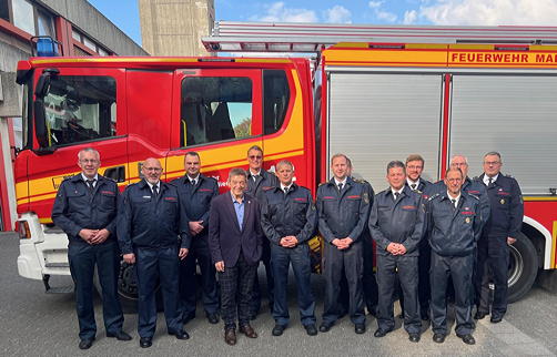 Bild: Begrüßung an der Feuer- und Rettungswache Marl (v.l.n.r.): Stefan Uhlenbrock ( Löschzugführer Sinsen), Ralf Czajerek (stellv. Stadtbrandmeister), Daniel Stappert (stellv. Löschzugführer Polsum), Bürgermeister Werner Arndt, Thomas Müller (Abteilungsleiter Aus- und Fortbildung), Roman Engler, stellv. Amtsleiter Peter Lechtenböhmer, Sebastian Wachtel (stellv. Löschzugführer Alt-Marl), Amtsleiter Rainald Pöter, Jan Büscher (stellv. Löschzugführer Hamm), Zoltan Bokor (Löschzugführer Alt-Marl), Lars Kuhlmann (Löschzugführer Lenkerbeck) und Rolf Minkley (stellv. Löschzugführer Lenkerbeck). Foto: Feuerwehr