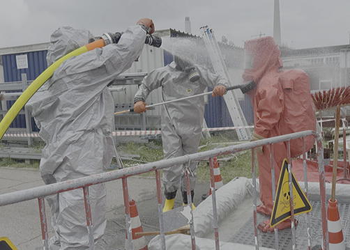 Zum anderen galt es, die Dekontamination von Einsatzkräften zu üben, aber auch von verletzten Personen, die mit Schadstoffen in Kontakt gekommen sind. Für möglichst realistische Rahmenbedingungen sorgte dabei eine Gruppe von Verletztendarstellern der DLRG.