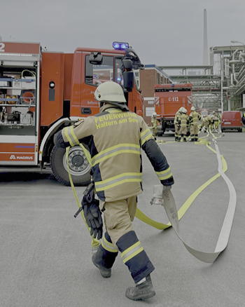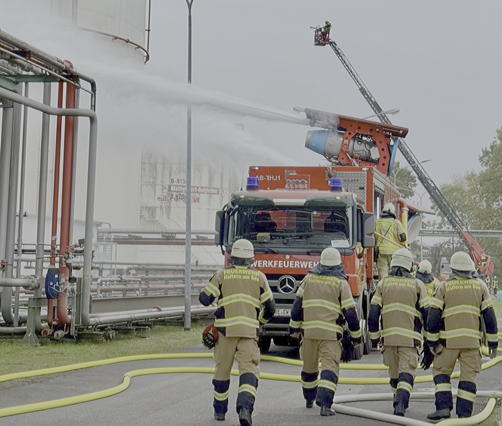 Die Übungsleitung hatte zwei Schwerpunkte ausgewählt. Zum einen galt es, große Mengen Wasser aus dem offenen Gewässer zu pumpen, um damit in luftigen Höhen einen Tank zu kühlen. Dabei kam auch das Turbinenlöschfahrzeug des Chemieparks zum Einsatz.