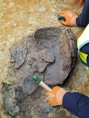 Ein weiterer eindrucksvoller Fund ist eine etwa 1,5 Meter tiefe trichterförmige Grube, in deren Boden eine große Tonschale eingelassen war – vermutlich ein früher „Erdkühlschrank“, in dem verderbliche Lebensmittel kühl gelagert wurden. Das Gefäß konnte vollständig geborgen werden. Das Verfüllmaterial wird derzeit im Labor untersucht, um nähere Erkenntnisse über seine Nutzung zu gewinnen.