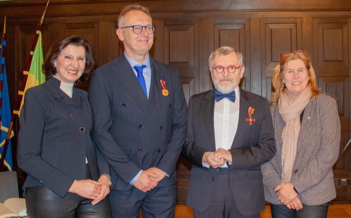 Bild: Die stellvertretende Landrätin Martina Eißing (r.) gratulierte gemeinsam mit Marita Bergmaier (l.), stellvertretende Bürgermeisterin der Stadt Recklinghausen, den beiden Ordensträgern Dr. Markus Dechêne (2. v. l.) und Dr. Norbert Bomholt (2. v. r.).