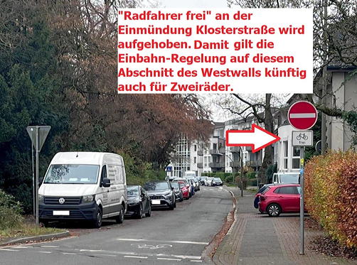 Radfahren gegen die Einbahnstraße ist nur erlaubt, wenn genug Platz für sichere Begegnungen ist. Empfohlen werden mindestens 3 Meter, an unübersichtlichen Stellen oder bei viel Verkehr 3,50 Meter. Am Westwall ist das oft nicht der Fall. Die Kurven erschweren die Sicht, und es gibt keine Ausweichstellen auf den 250 Metern. Es gab schon Konflikte zwischen Autofahrern und Radfahrern, die entgegen der Fahrtrichtung fuhren.