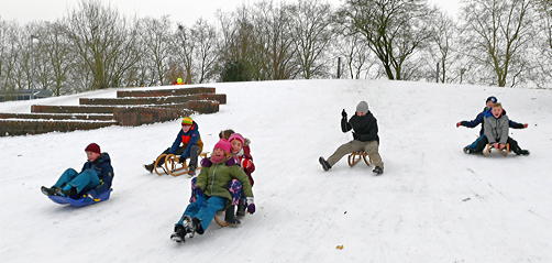 Vest. Dass Wintertage nicht nur Einschränkungen im Verkehr und Unfallgefahren bedeuten, bewiesen die Kinder im Kreisgebiet, die mit ihren Schlitten die noch recht dünne Schneedecke für selten gewordenen Winterspaß entdeckten.