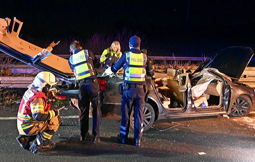 Der 23-jährige Fahrer des VW Passat erlag nach erfolglosen Reanimationsmaßnahmen am Unfallort seinen Verletzungen. Drei der vier Insassen konnten sich nach ersten Erkenntnissen noch vor dem Eintreffen der Rettungskräfte von Polizei und Feuerwehr selbst aus dem Fahrzeug befreien. Einen der Mitfahrer brachten Rettungskräfte leicht verletzt in ein Krankenhaus. Zwei weitere Insassen blieben unverletzt.
