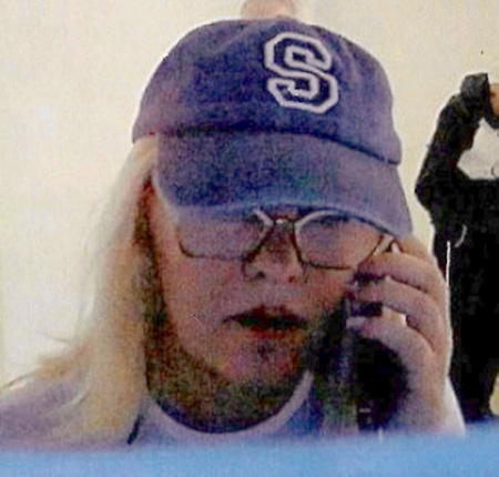 Bekleidung blaue Kappe mit Aufdruck „S“, hellblaues T-Shirt, dunkelblaue Stoffhose, Sneaker, Brille, Haarfarbe blond, Figur kräftig.