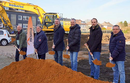 Bild: Der symbolische Spatenstich für das Bauprojekt „In den Gärten“: Im Foto (v.l.) Hans-Peter Schipper (stellv. Aufsichtsratsvorsitzender der neuma), Otto Schübbe (neuma-Mieterbeiratsvorsitzender), Thomas Terhorst (Aufsichtsratsvorsitzender der neuma), Christoph Thier (neuma-Geschäftsführer), Marc Ruppenthal (neuma-Architekt) und Boris Baf (Leiter Vermietung der neuma). Foto: Michael Kahls