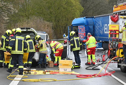 Marl. Bei einem Frontalcrash zwischen einer Sattelzugmaschine und einem Pkw auf Marler Stadtgebiet, kurz vor der Stadtgrenze zu Haltern und Dorsten, wurde eine Autofahrerin schwer verletzt.
