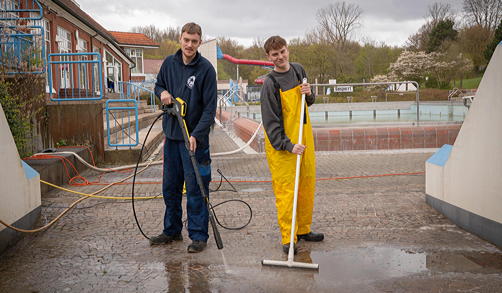 Bild: Björn Breuer (l.) und Azubi Ben Henneboele sind Teil des Aufrüstungstrupps für die näherrückende Freibadsaison im Copa Ca Backum.