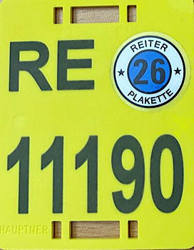 Wer in der freien Landschaft oder im Wald reitet, muss ein gut sichtbares, am Pferd beidseitig angebrachtes gültiges Kennzeichen führen. Weil das Reitkennzeichen unabhängig vom Zeitpunkt des Erwerbs immer nur für ein Kalenderjahr gilt, muss es für 2026 mit einer blauen Jahresplakette gültig gemacht werden.