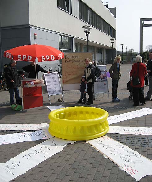 Dorsten (om). SPD-Stadtverband und der Kreisverband der Genossen waren mit der Aktion „Damit unsere Kinder nicht baden gehen“ auf dem Platz der Deutschen Einheit zufrieden. Der aufwändige Aufbau mit Kinderplanschbecken und Infotafeln war schon ein „Hingucker“. Schnell kamen die SPD-Vertreter und Arbeitskreisvorsitzenden Elsbeth Kolloczek und Volker Jenau, Kreistagsmitglied Hans-Georg Wiemers sowie die Arbeitskreismitarbeiter Winnie Hess, Heike Unkel, Dirk Gross und Britta Zumbrink mit Eltern und Kindern ins Gespräch. Die SPD setzt sich für den Ausbau von Bildungs- und Betreuungsmaßnahmen in Kindergärten und Schulen im Primar- und Sekundarbereich ein. „Wir wollen Chancengleichheit für alle Kinder. Denn es darf nicht sein, dass in Deutschland noch immer die soziale Herkunft entscheidend ist für den späteren Bildungsabschluss.“ Gleichzeitig fordern die Dorstener Genossen die Benennung eines Präventionsbeauftragten in Dorsten, um Kinderschutz und beste Betreuung von Anfang an zu gewährleisten. Dass sich spontan eine Dorstenerin zur Mitarbeit im Arbeitskreis bereit erklärte, erfreute die Genossen besonders.