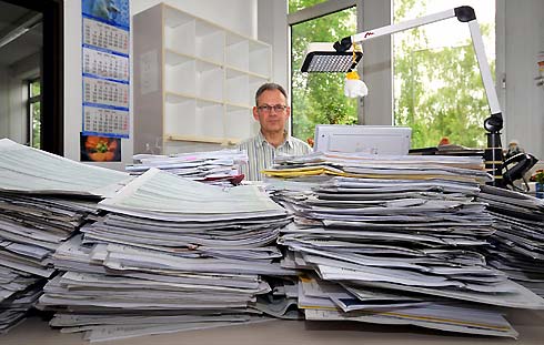 Einer von bis zu 16 Mitarbeitern in der Zentralerfassung vor acht Stapeln mit tausenden Steuererklärungen, die allein in der ersten Wochenhälfte hereingekommen sind. FOTO: Mengedoht