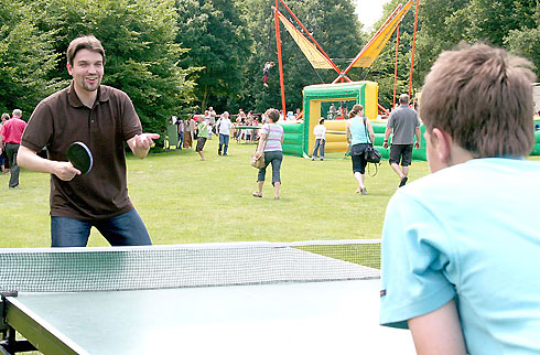 Einmal seine Kräfte mit dem Bürgermeister messen – beim Sportfest war das möglich, allerdings nur an der Tischtennisplatte. Hier stand Hobbyspieler Paetzel als Trainingsgegner parat. Manuel Kroll (13), Spieler beim TTC MJK Herten ließ sich diese Chance nicht entgehen und gewann das Match mit 11:9 Punkten.